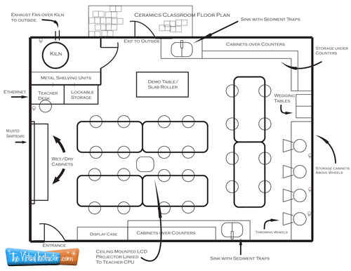 它总是一个好主意来制定一个计划你的教室。地板计划很容易画,可以创建一个有效的课堂布局。当你画平面图的教室,把教室的基本功能,并提供你需要的一切的地方。包括家具的尺寸,您将使用在你的教室,如果信息是可用的。下面你会发现一个示例平面图,我创建了一个陶瓷教室…