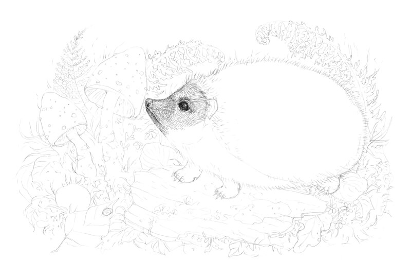 我开始画与光铅笔标记,概述了刺猬的大致形状,蘑菇,一块树皮,在后台核心的蕨类植物的叶子。