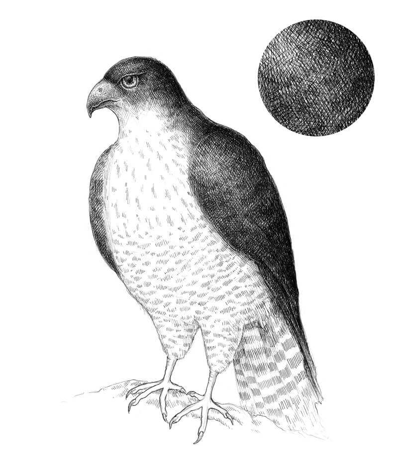 我给“猎鹰”更多的体积,用轮廓孵化在头部和颈部区域。上部的头部应该轻一点反映了光源,所以我确定没有太多的墨水标记。