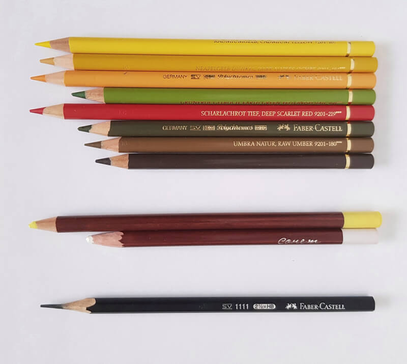 对于这个项目,我将使用一组辉柏嘉Polychromos彩色铅笔。你会发现下面的列表(在这张照片里,从上到下):