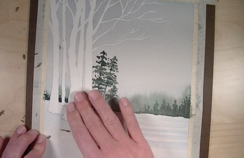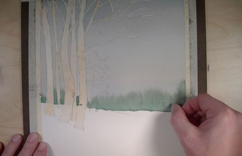 The surface completely dry, the liquid mask can be removed by rubbing with a finger, revealing clean, white shapes for the birch trees.