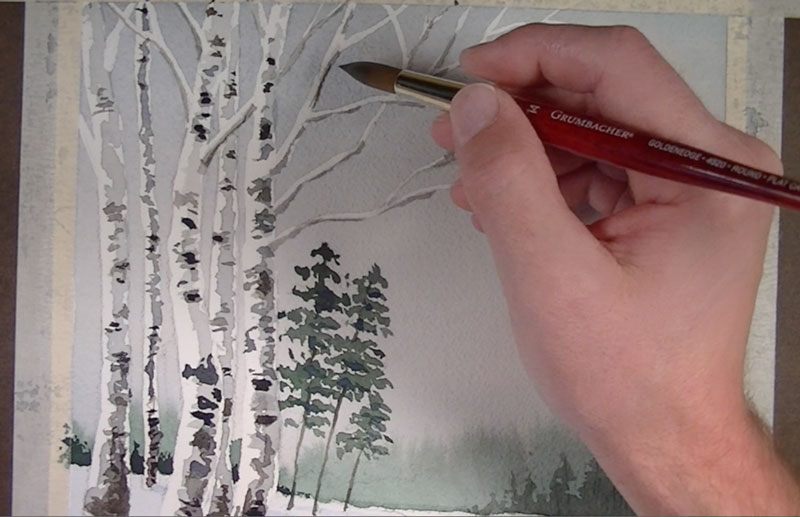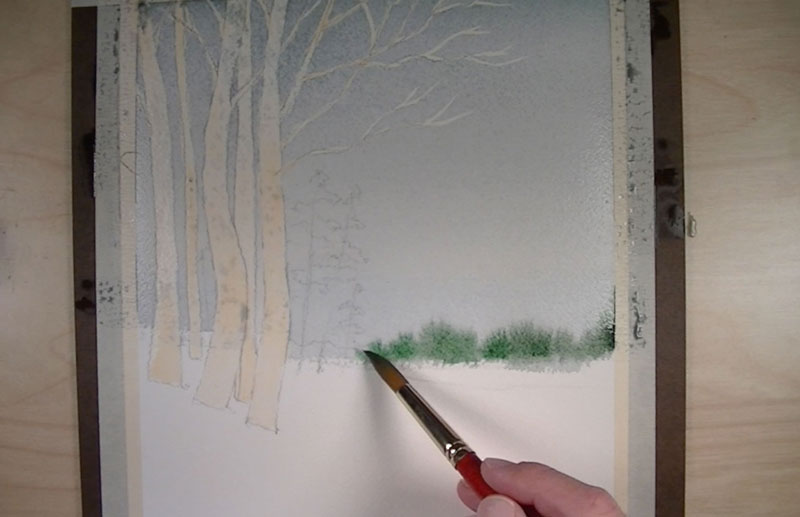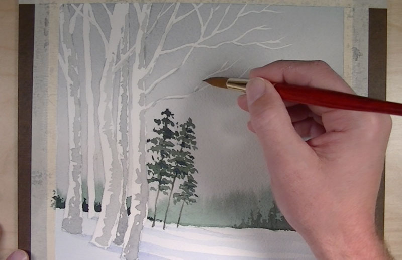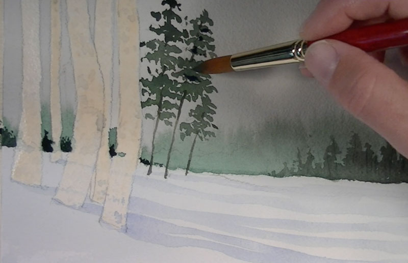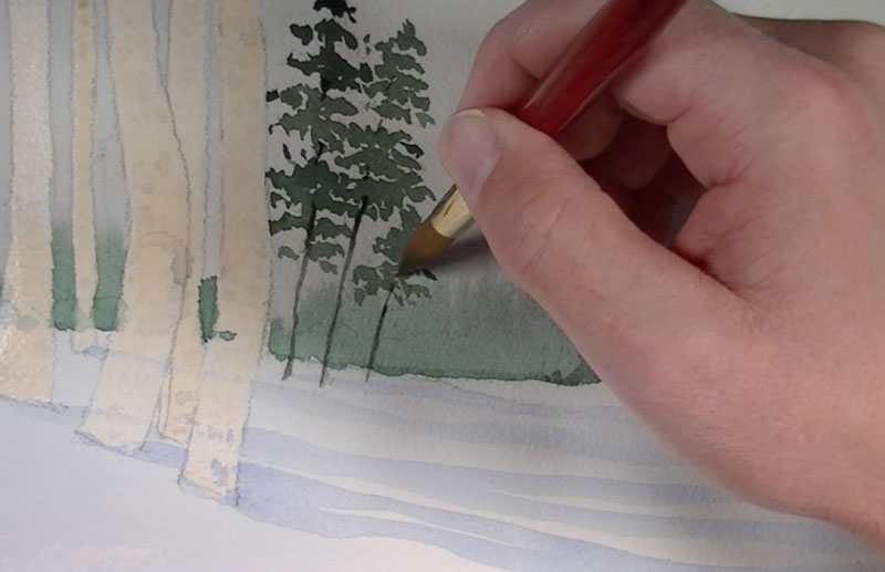 A heavier amount of Ultramarine is added to our green and painted in behind the birch trunks for an additional line of trees. This color is also added in areas of shadow on the pine trees.