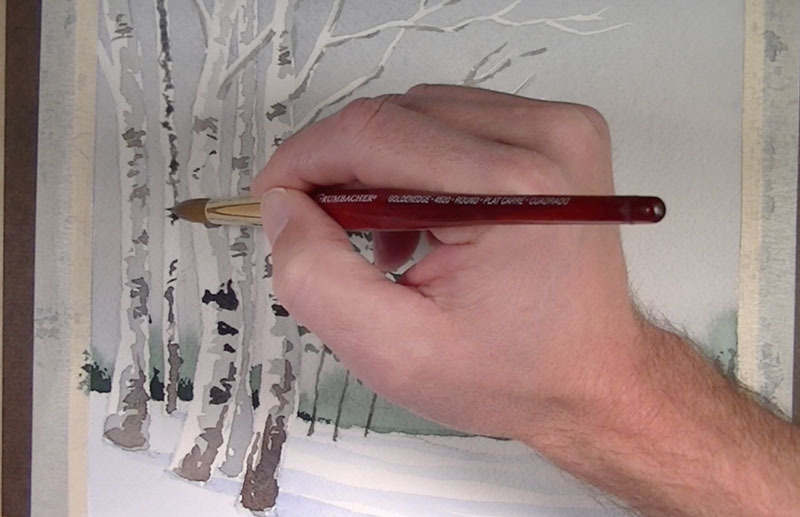 Progressively, darker shapes and lines are added to build up the detail on the trunks of the birch trees.