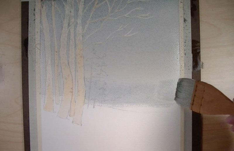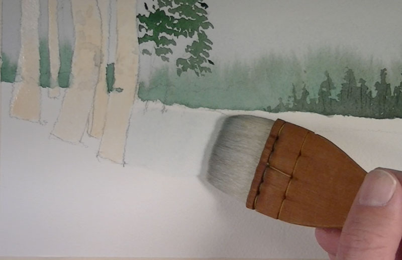 A light wash is applied using the same cool gray used for the background over the areas of snow in the foreground.