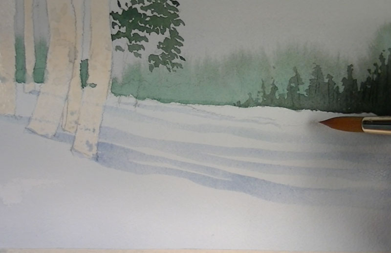 A light wash of Ultramarine is pulled out from the base of the birch and pine trees to create long cast shadows on the snow.