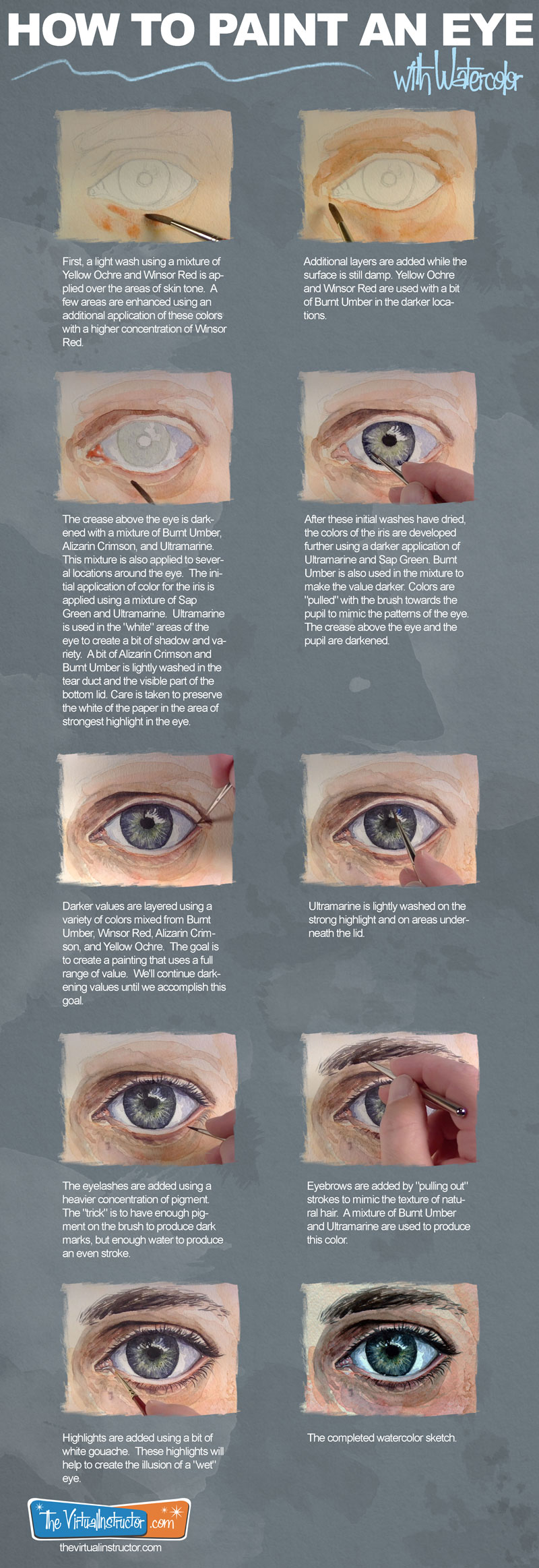 眼睛上方的折痕是昏暗的,红棕色,暗红,深蓝色。这种混合物也应用到几个地方在眼睛周围。最初的应用程序应用虹膜的颜色使用Sap绿色和深蓝色的混合物。使用深蓝色眼睛的“白色”地区创建的影子和品种。一点暗红和红棕色轻轻洗在泪腺和底部的盖子的可见部分。是注意保护领域的白色的纸最突出的眼睛。