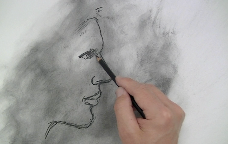 使用一根柔软的压缩木炭在黑暗的价值。这些区域平滑使用一个手指。